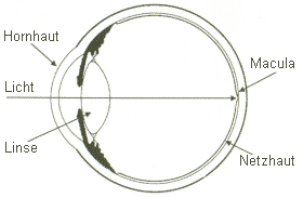 Abb. 1: Längsschnitt durch ein Auge. Das Licht fällt (von links) durch die Hornhaut und die Linse in das Auge und trifft (rechts) auf die Netzhaut, den Augenhintergrund. In der Netzhautmitte, der Makula, befinden sich die meisten Sinneszellen, so daß man in der Mitte des Gesichtsfeldes immer am besten sieht