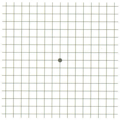 Abb. 5: Das Amsler-Netz ist eine Testfigur, um die Funktion der Makula zu testen. Wenn Sie den Punkt in der Mitte der Figur fixieren, erscheinen die Linien am Rande Ihrer Augen unschärfer; das ist normal. Verbiegungen der Linien und Verzerrungen der Quadrate jedoch sind Hinweise auf krankhafte Veränderungen der Netzhaut.